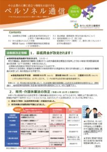 ペルソネル通信 2023年9月号「ペルソネル通信」をアップしました。中小企業の人事に役立つ情報をお届けしています。 今号の記事「法改正情報」の最低賃金額の改定額については、作成中においては正式決定されておらず、「予定」と […]